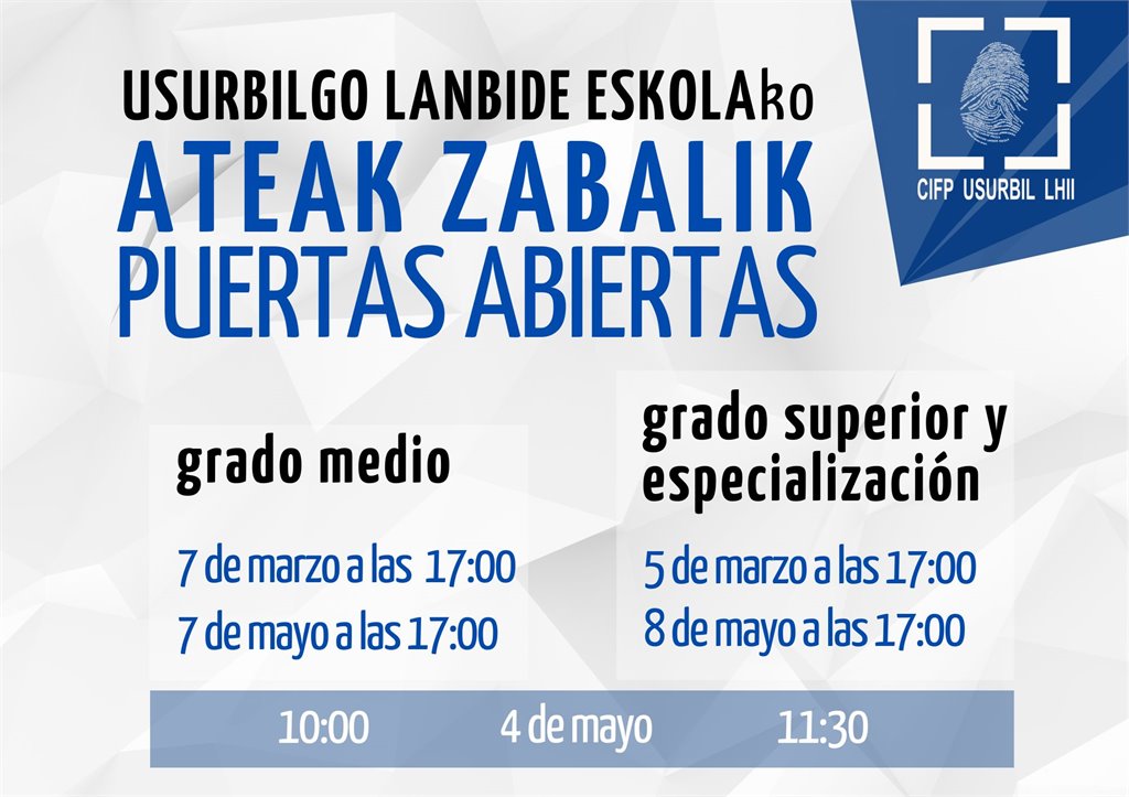 Ya hemos fijado las fechas de las jornadas de Puertas Abiertas de este año. Las primeras citas serán en marzo; el martes, 5 de marzo, a las 17:00 de la tarde será el turno del alumnado interesado en Grado Superior y Especialización, mientras que el jueves, 7 de marzo, será el de Grado Medio a la misma hora.